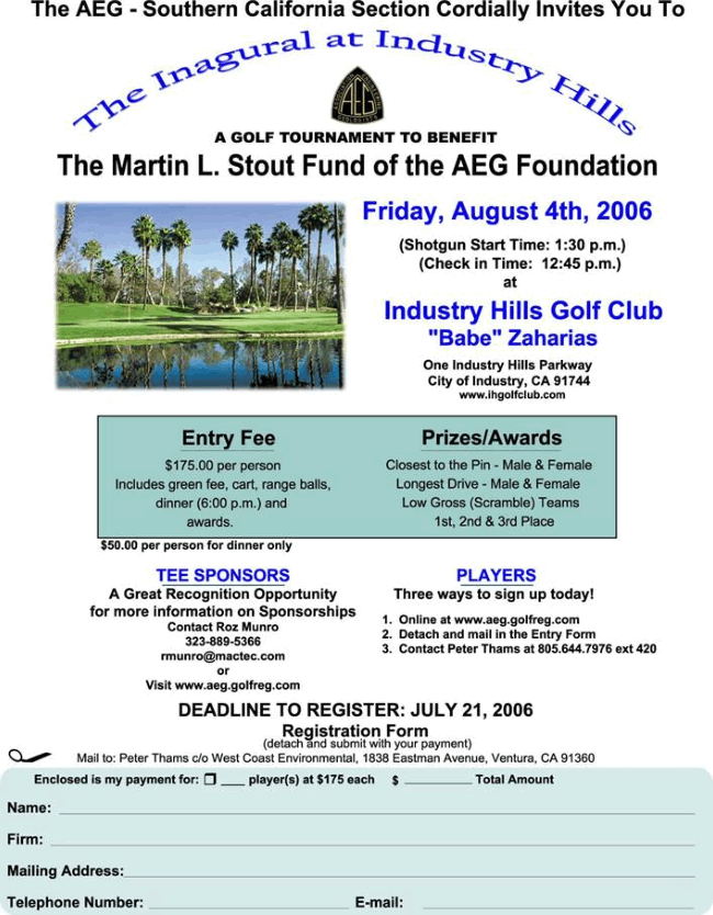 The southern California Section is planning a golf tournament to benefit the AEG Foundation - Martin L. Stout Scholarship. As stated on the AEG website: "The Martin L. Stout Scholarship is in memory of Dr. Martin L. Stout, Professor of Geology at California State University, Los Angeles from 1960 to 1990. He is remembered by all of his students for his passionate and insightful instruction in engineering geology. Dr. Stout guided his students through and beyond the fundamentals of engineering geology, often using KodachromeT slides for illustration. He emphasized hands-on experience and critical thought. Dr. Stout was well known for his expertise on mega landslides, his worldly travels, his good humor, and his gracious manner. This scholarship supports his legacy."